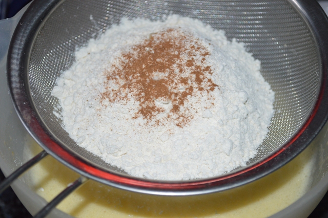 - Ara posa-hi la farina, el bicarbonat i la canyella en pols, passant-ho per un sedàs. No cal que t'omplis d'estris la cuina: un colador normal i corrent et farà el mateix servei.